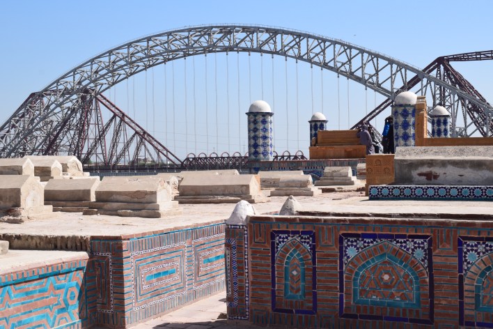 I followed policeman on motorbike crossing the landmark bridge over Indus to visit Sateen Jo Aastan, a tomb complex and shrine of Seven sisters. Police pick-up was waiting there to follow me too.