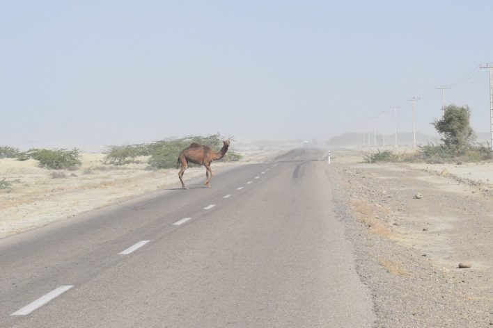 Riverbanks were dry-cracked. Camels were grazing beside rare trees and sometimes crossing the road. Balochistan! Wind was blowing the sand around, there was a small tornado in the distance. White waves of sand were running over the asphalt road turning the world into a mystical fog.