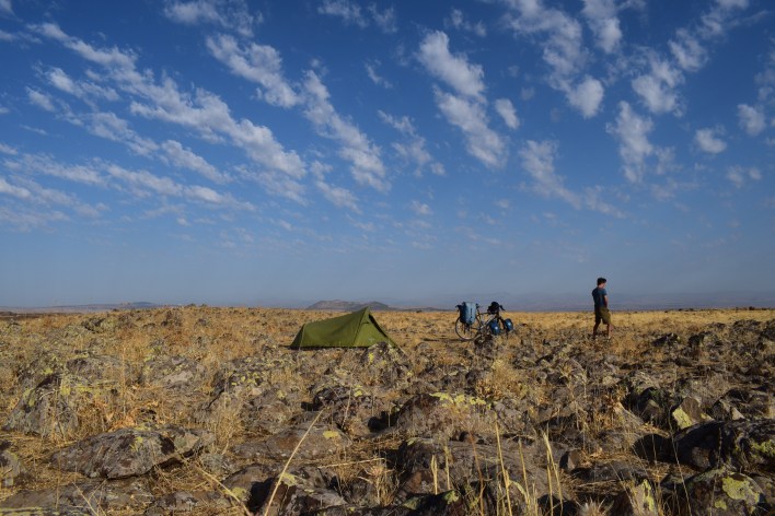 After setting my tent up at the small lake one evening I was surprised by the herd of a few hundred goats approaching me. Will they eat my tent?